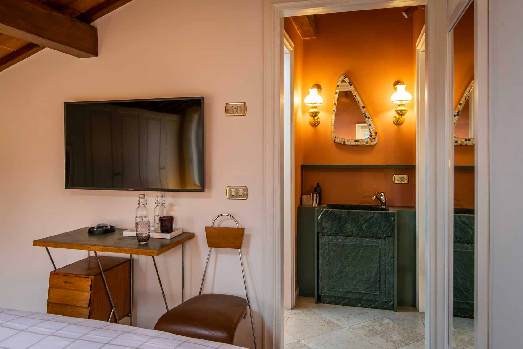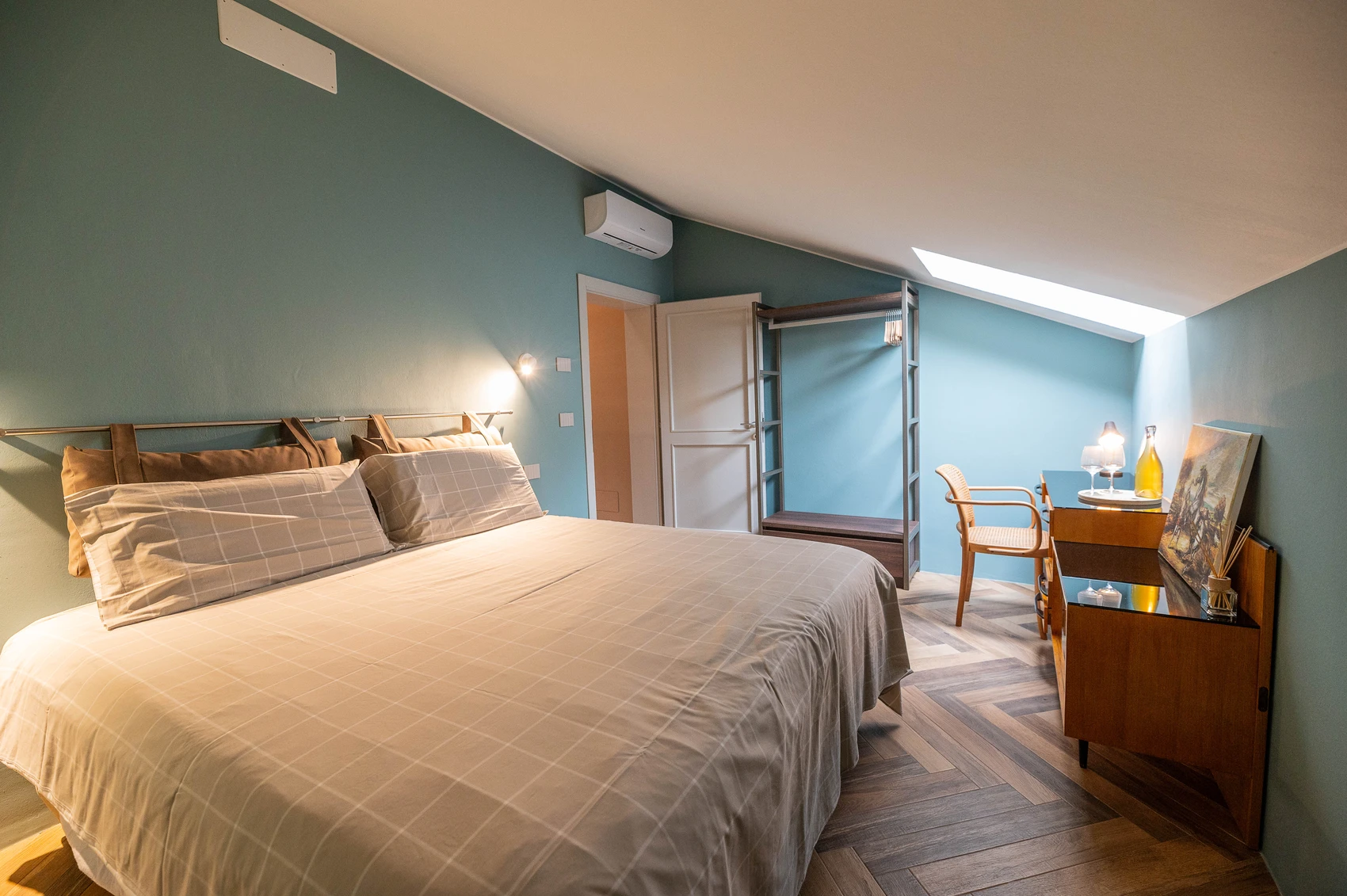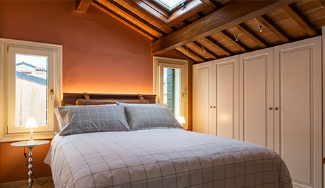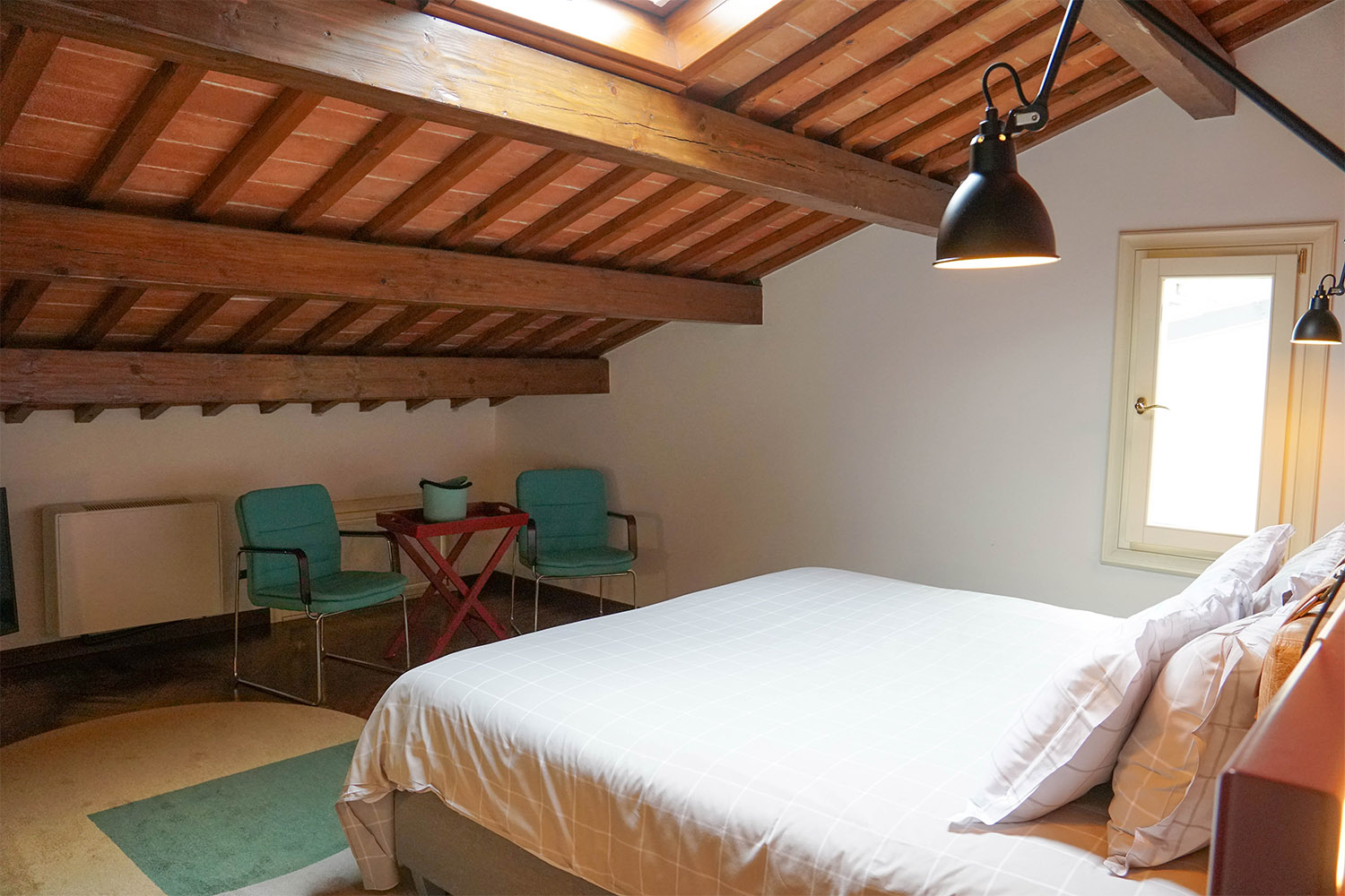 Compatta e situata nella suggestiva mansarda, la camera è ottimizzata in ogni dettaglio.