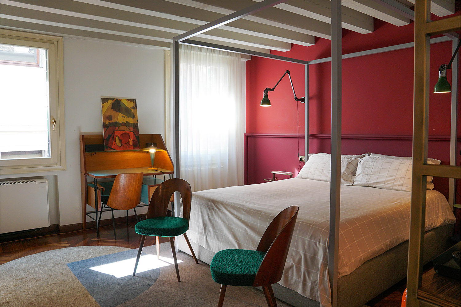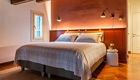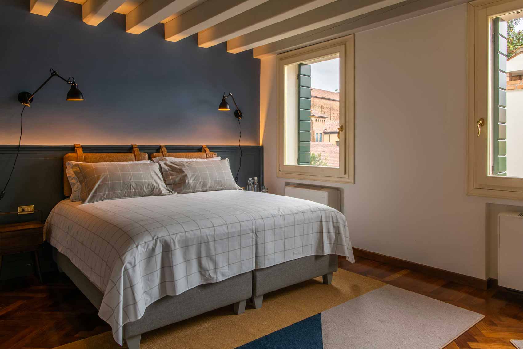 La nostra suite deluxe: tutto lo spazio di cui hai bisogno, arredi di design, pavimento in parquet, bagno king-size e un’imperdibile vista sulla Chiesa degli Eremitani.